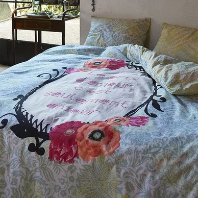 Die Bettwäsche Bibi der Holländischen Marke Covers & Co ist eine wunderschöne Bettwäsche mit einem Blumenmuster. Auf der Vorderseite ist ein Emblem verziert mit floralen Motiven welches in der Mitte einen französischen Schriftzug hat. Diese wunderschöne Bettwäsche schafft eine Frühlingsatmosphäre in ihrem Schlafzimmer. Die Bettwäsche besteht aus renforcé Baumwolle, welche dank des glatten Gewebes und der Leinwandbindung eine hohe Feuchtigkeitsaufnahme vorweisen kann und zudem noch sehr temperaturausgleichend wirkt. Im Lieferumfang enthalten sind neben der Bettwäsche auch ein 80 x 80 cm großes Kissen welches auch mit dem Muster versehen ist.